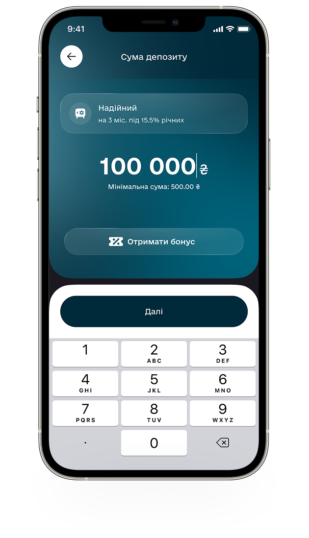 Отримайте від 16% до 17,5% річних з Акцією «Надійний бонус» при розміщені через мобільний застосунок депозиту «Надійний» у гривні на 93, 184 дні на суму від 30 000 гривень